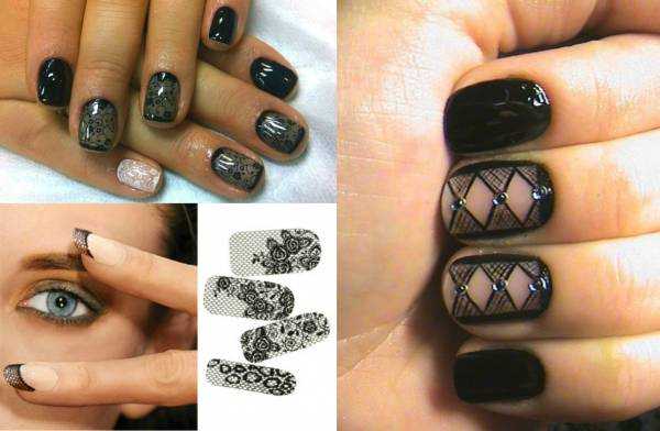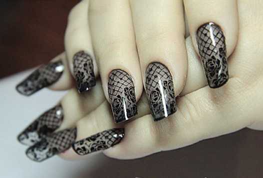 После основного тона на пластину пальца наносится специальный клеевой гелевый состав, а сверху прикладывается фольга. Несколько аккуратных движений апельсиновой палочкой – и на ногтях отпечатается прекрасный узор. В продаже можно найти специальные водные наклейки для ногтей, изображающие вуаль. С их помощью можно создать прекрасный маникюр. Можно воспользоваться настоящим тонким кружевом, которое наносится на ногти и закрепляется при помощи тонированного прозрачного лака. При выборе материала отдавайте предпочтение качественной ткани. Если вы умеете рисовать, то попробуйте создать ажурный эскиз из акриловых или гелевых красок. При помощи тонкой кисточки на ногти наносится сеточка, а сверху покрывается прозрачным лаком с добавлением пары капель черного пигмента.