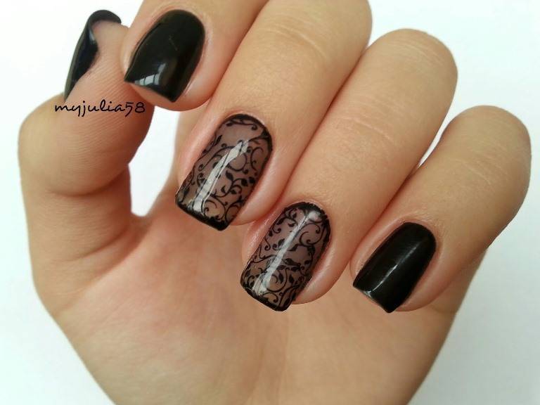 Красиво смотрится «вуаль», комбинированная с техникой негативного пространства. Например, часть ногтя может иметь капроновое оформление, а вторая — кружевной узор на неокрашенной ногтевой пластине.