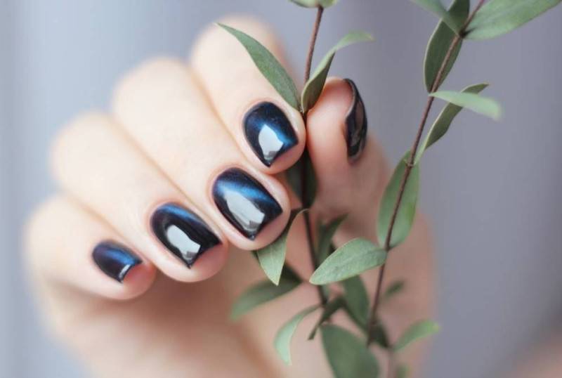 Черный колор с синим или бордовым бликом очаровывает своей глубиной. С помощью глянцевого топа мерцающий эффект усиливается, и ноготки выглядят великолепно.