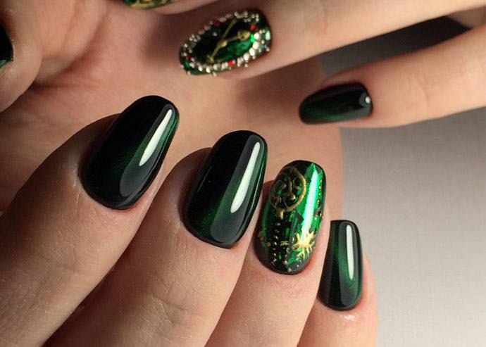 Отлично смотрится на длинных, коротких ногтях. Зеленый цвет маникюра самодостаточен, не требует дополнительных украшений. Но если выбранный дизайн это подразумевает, то лучше использовать декорирование стразами или камнями. Такие элементы декора придутся под стать зеленому маникюру «кошачий глаз». Блески, бульонки и пр. только удешевят внешний вид зеленых ноготков. Истинной стильной ноткой в образе станет глубокий изумрудный оттенок маникюра.