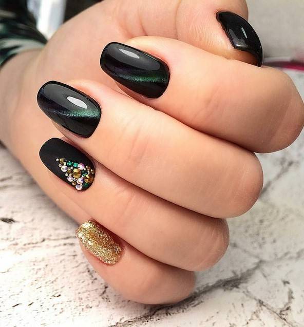 Облагородить темный оттенок возможно, используя стразы или жидкие камни, которые имитируют драгоценные, золотой лак.