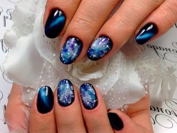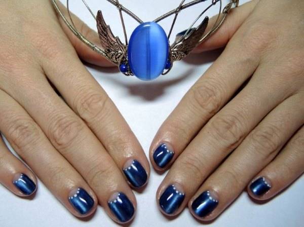 Отличный маникюр в синем цвете подойдет для любого сезона и события. Переливы добавят синему благородного вида и особого шарма. Особенно это касается темных оттенков. Синий маникюр любого оттенка, но с эффектом «кошачий глаз», отлично будет гармонировать с любым нарядом и украсит даже короткие ноготки. Эффектно смотрится и матовое однотонное покрытие без дизайна.