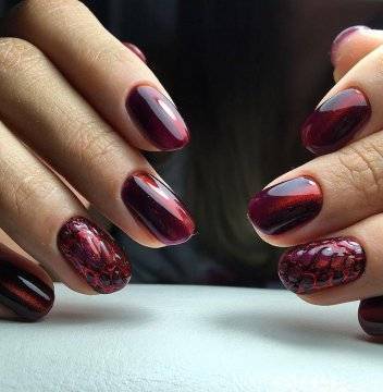 - Элегантное и модное бордовое «кошачье» покрытие для ноготков смотрится роскошно и стильно. Удачный выбор — матовый однотонный маникюр. Возможно воплощение разных идей дизайна бордовых ногтей: от росписи до сложных аппликаций.