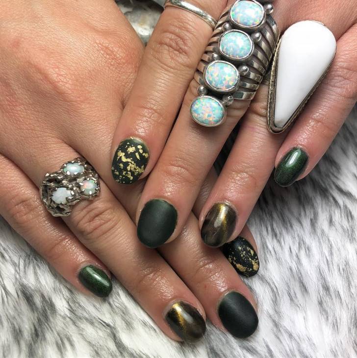 Такие элементы декора придутся под стать зеленому маникюру «кошачий глаз». Блески, бульонки и пр. только удешевят внешний вид зеленых ноготков.