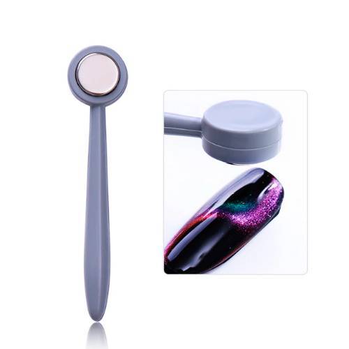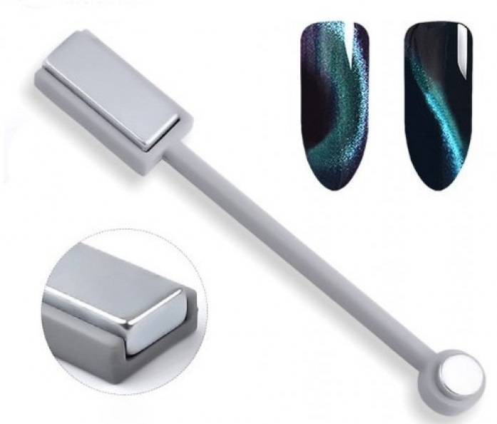 . Сам магнит представляет из себя небольшой намагниченный квадратик размером чуть более ногтя, снабженный удобной ручкой, и продается вместе с другими материалами для маникюра.