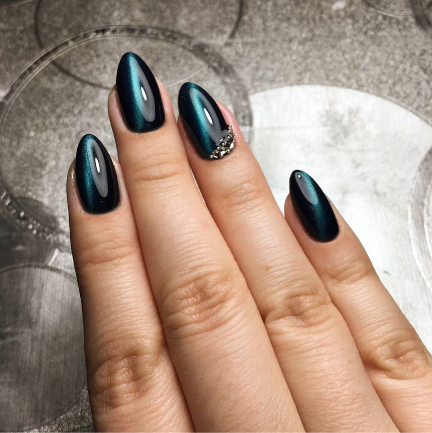 Сначала ноготки покрывают основой (базой) для гель-лака, которую просушивают в ультрафиолетовой лампе. Затем наносят зеленый гель-лак, который тоже сушат. Магнит подносить сразу не нужно. В видео мастер этот момент описывает. На фото показан прекрасный, глубокий изумрудный оттенок, который очень похож на кошачий глаз.