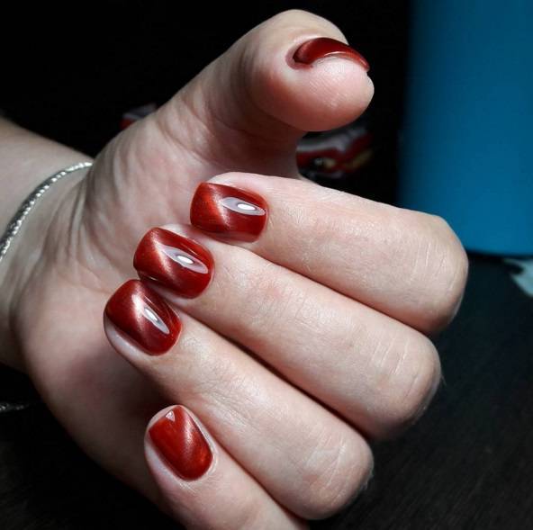 Бордовый маникюр кошачий глаз – идеальное решение для уверенных в себе и смелых девушек. Сам по себе цвет глубокий и утонченный. В технике кошачий глаз он переливается всеми оттенками красного и буквально подстраивается под настроение своей владелицы.