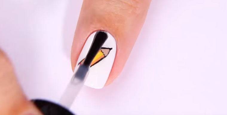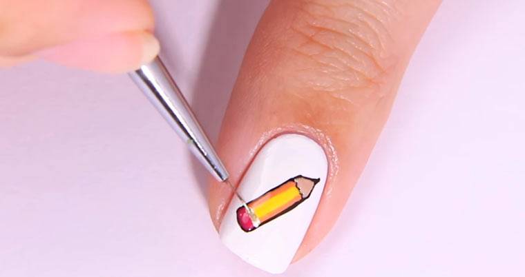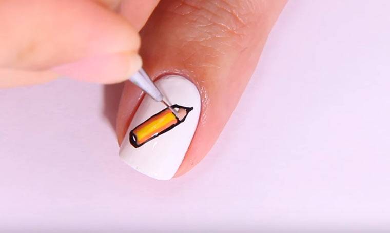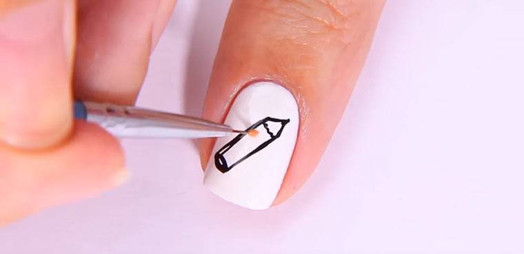 5. Черным лаком нарисуйте на указательном контур карандаша.