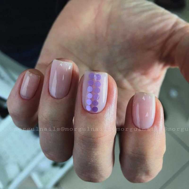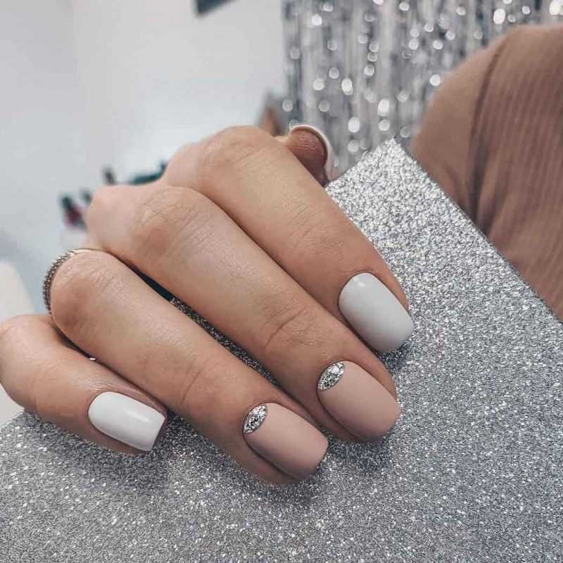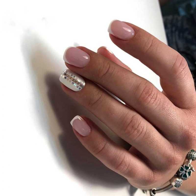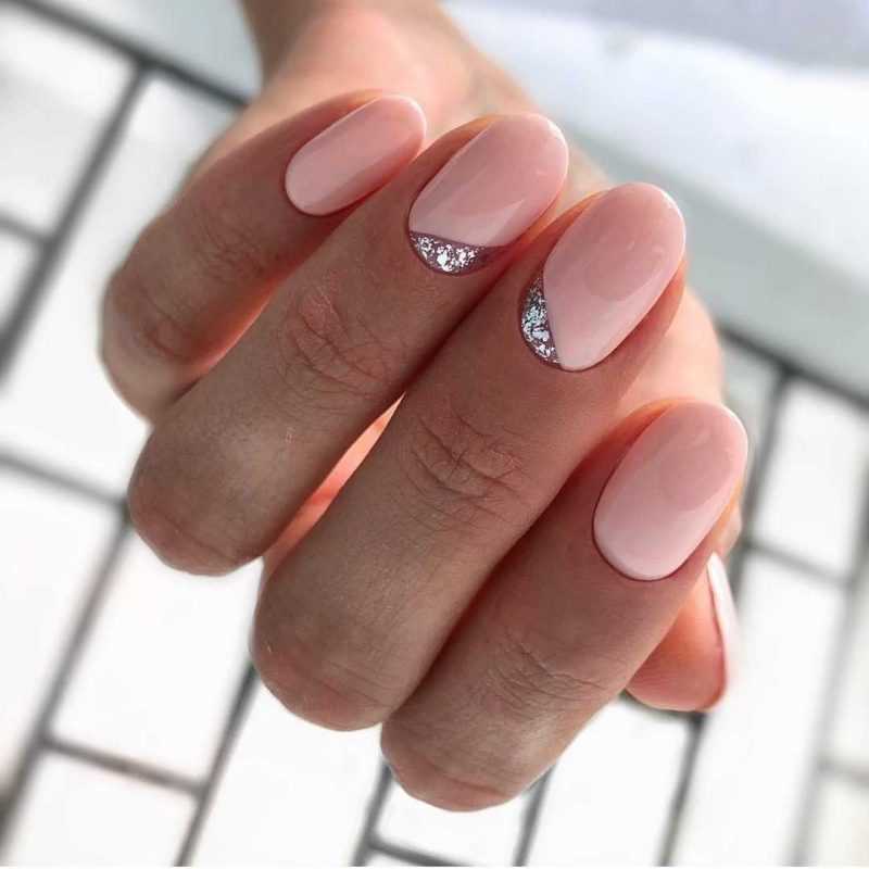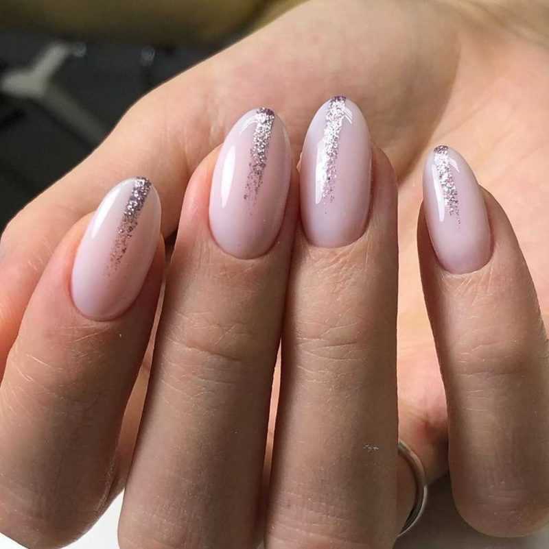Маникюр на первое сентября с серебристыми блёстками. Нежный и простой дизайн ногтей на нюдовом лаке.