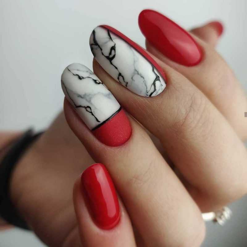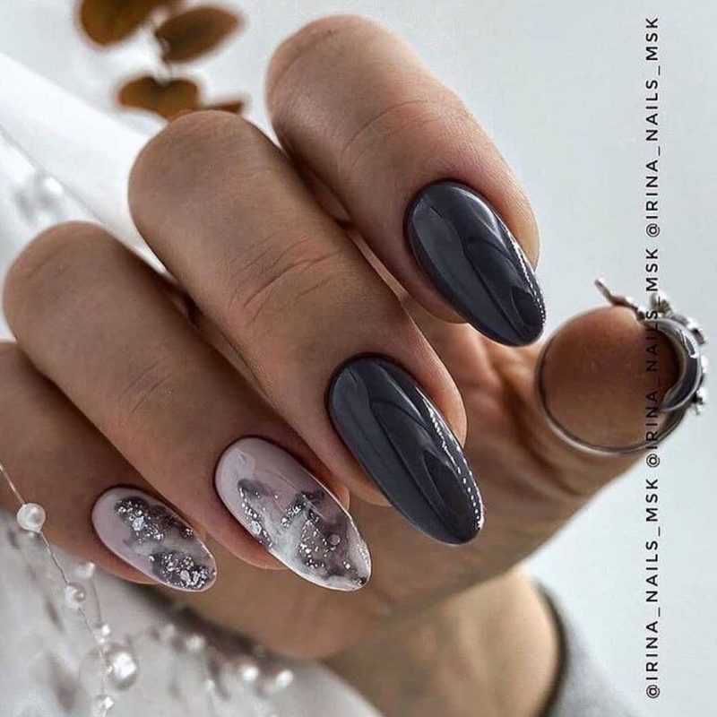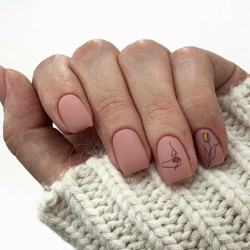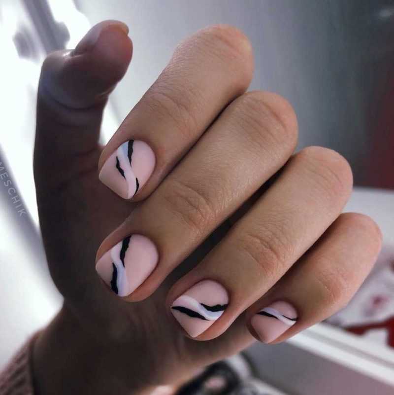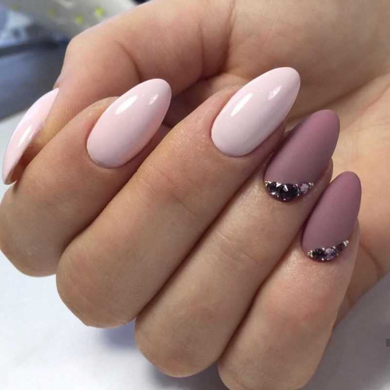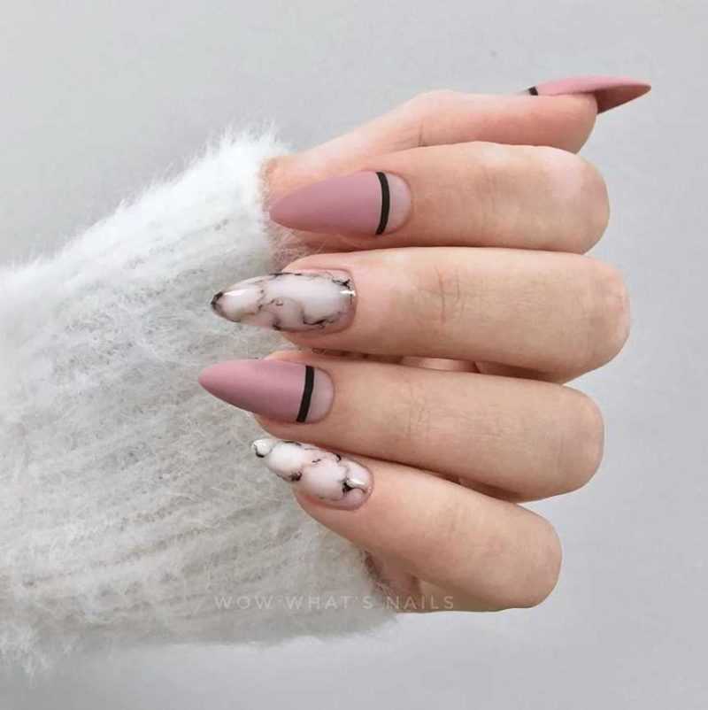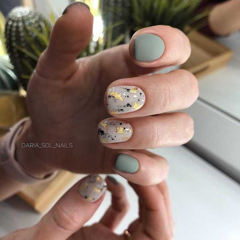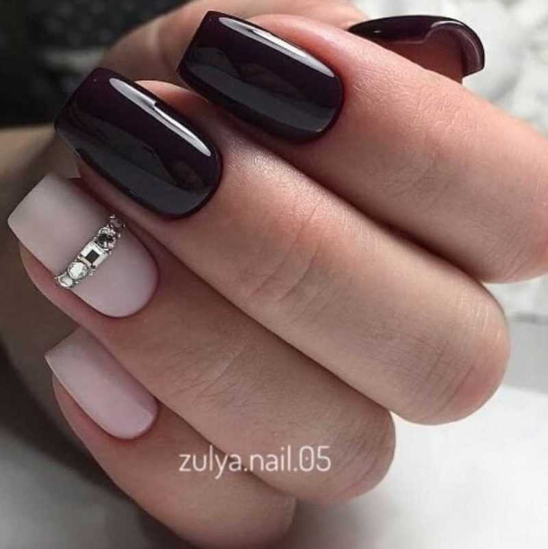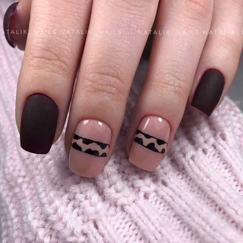 Необычно и стильно выглядят ногти, покрытые матовым лаком или сочетание глянца и матовой текстуры. Для создания такого дизайна потребуется любой лак для ногтей и матовое топовое покрытие.