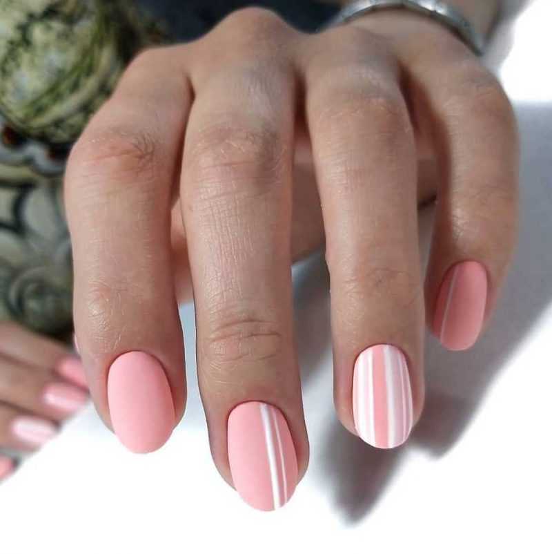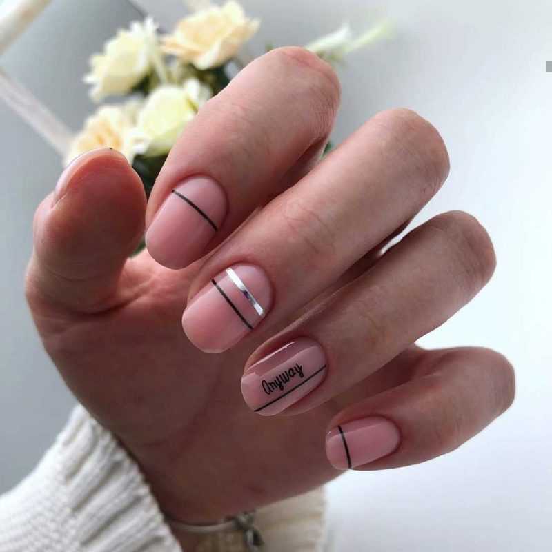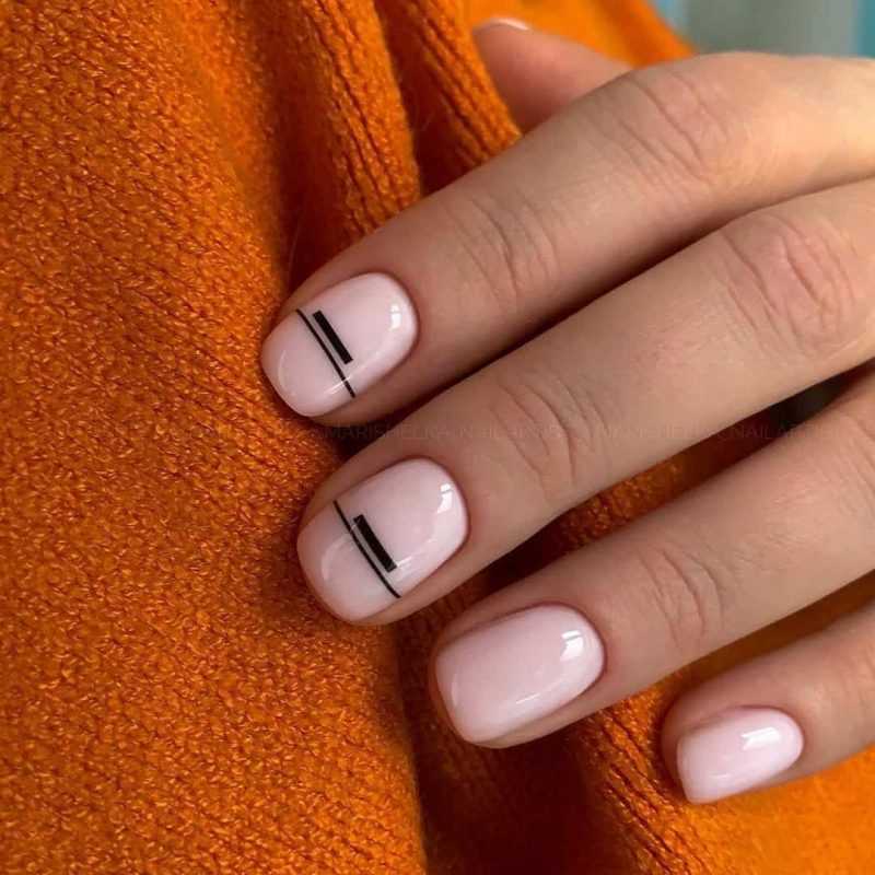 Фото маникюра на 1 сентября. Маникюр на короткие ногти в нежных тонах с цветными полосками.