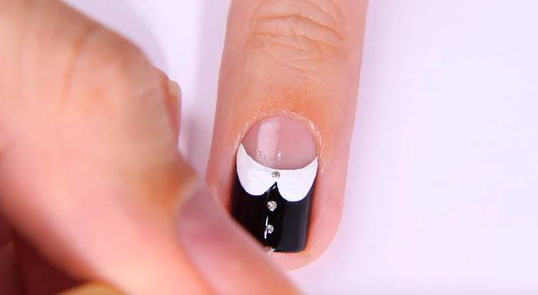 Детали прикрепляются к ногтю по одной, из них должен создаваться рисунок. Таким способом вы сможете воссоздать любую фигуру. Вы можете сделать рисунок, который будет начинаться на одном ногте, а продолжаться на других соседних.