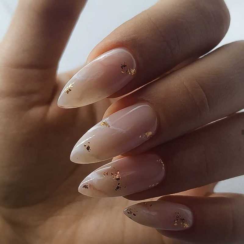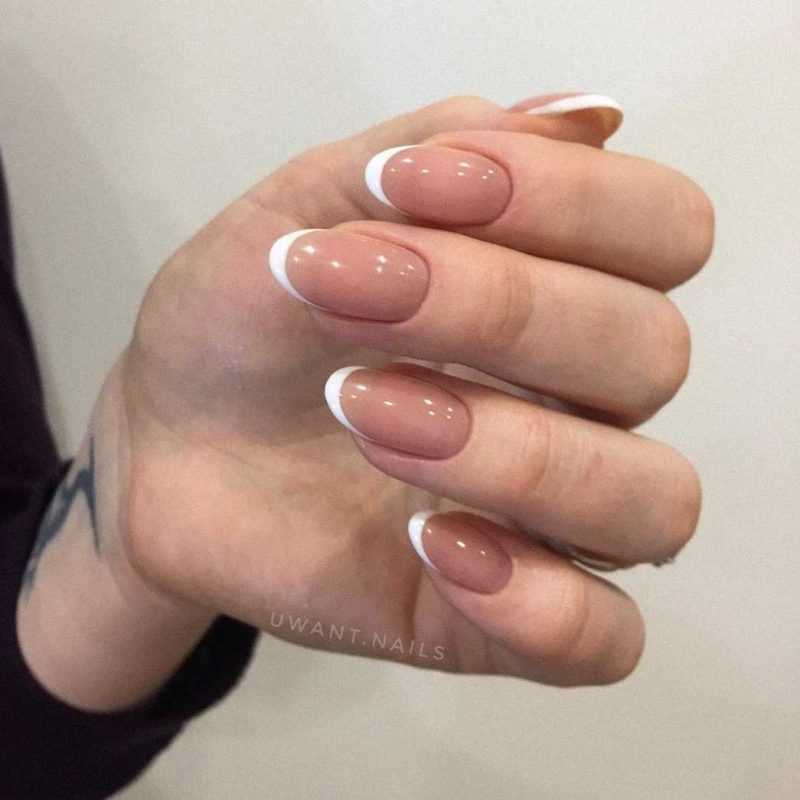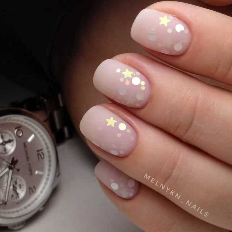 На небольшой длине очень гармонично впишется овальная форма ногтей и форма мягкий квадрат. В качестве дизайна прекрасно подойдут минималистичные рисунки, небольшое количество блесток золотого и серебряного цветов и лунный маникюр. Если имеется хотя бы пару миллиметров свободного края подумайте о французском маникюре в классическом исполнении.