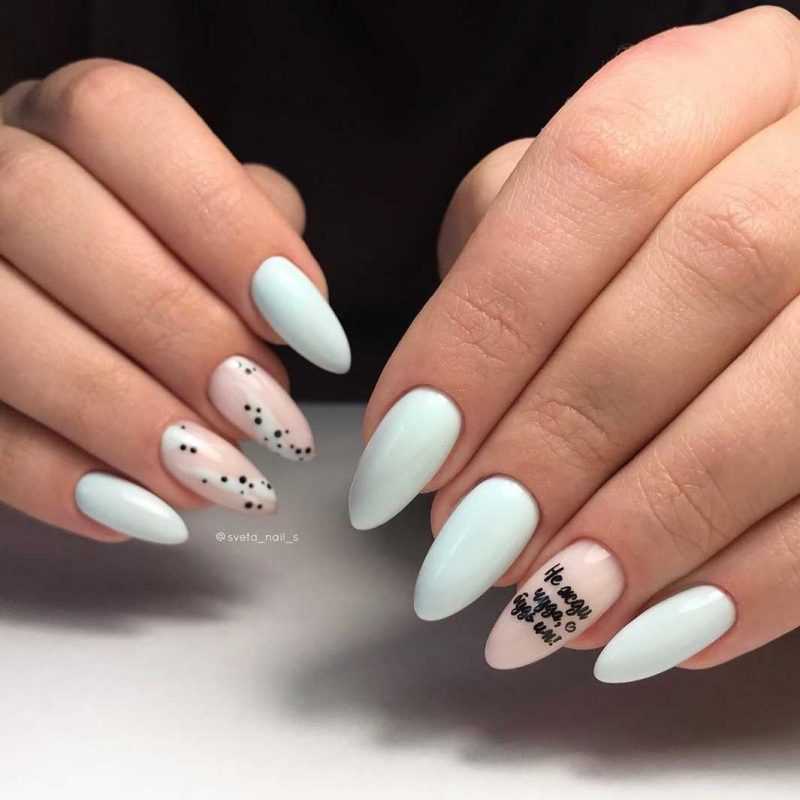 Маникюр миндальной формы на 1 сентября. Зеленый матовый маникюр в белый горошек.