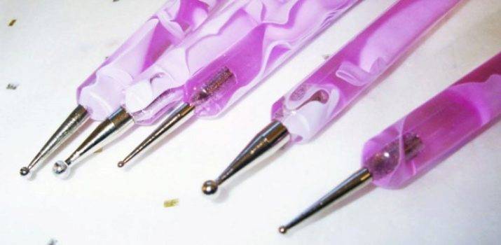 Дотс – специальный инструмент, позволяющий наносить мелкие вкрапления и волнистые линии. Данный инструмент необходим при создании маникюра с кругами разного размера. Размер шариков на инструменте мастер выбирает в зависимости от вида выполняемых работ. Данный инструмент можно приобрести в специализированных магазинах или изготовить собственноручно из шпильки для волос. Опытные мастера иногда используют простые деревянные зубочистки вместо дотса.