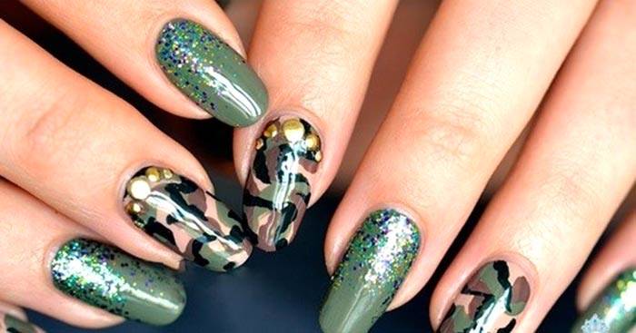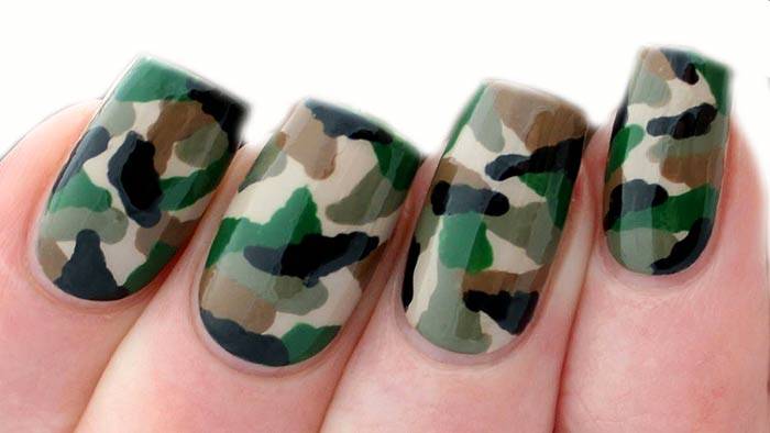 И не будем забывать о том, что хаки прочно ассоциируется с военной формой. Это отличный повод сделать маникюр с камуфляжным рисунком. Особенно актуален такой дизайн на соответствующие праздники или под определенный стиль в одежде.