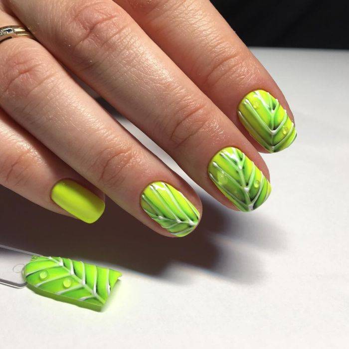 Настоящим хитом следующего лета станет модный маникюр в стиле ботаника. Некогда популярные веточки сменятся сочной тропической листвой, которую можно нарисовать кистью самостоятельно или при желании использовать подходящие переводные наклейки.