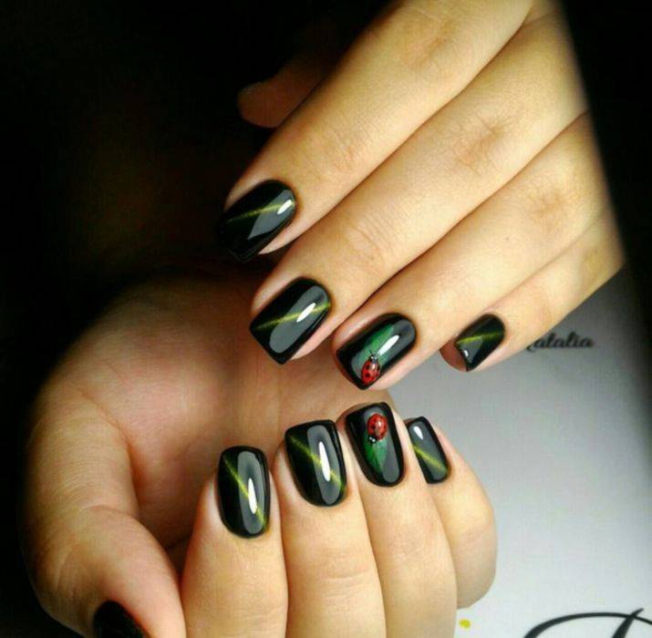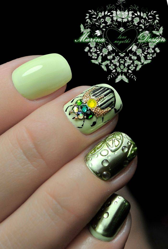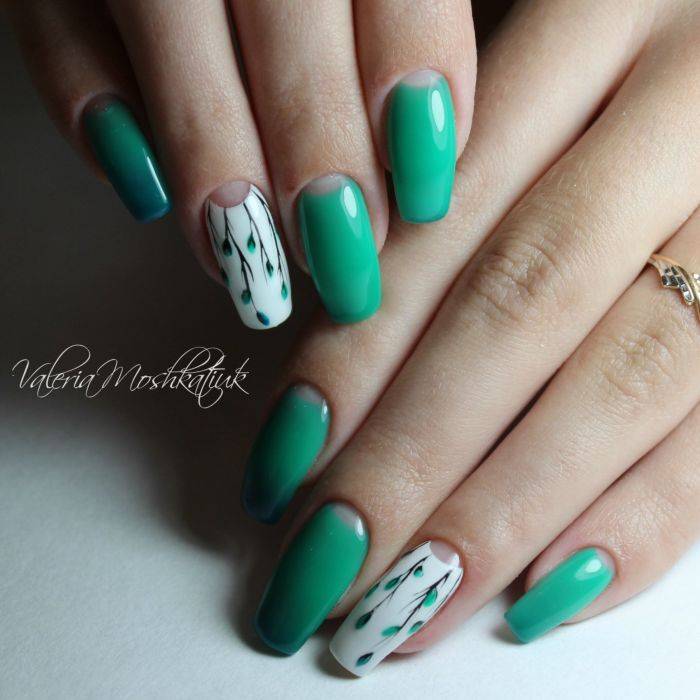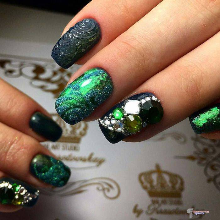 С развитием nail индустрии появился огромный выбор УФ-покрытий с интересными эффектами, декора и аксессуаров для ногтей. Все это многообразие миксуется между собой и руками опытных мастеров создаются потрясающей красоты варианты дизайна ногтей. Для зеленого маникюра актуальны следующие варианты исполнения: