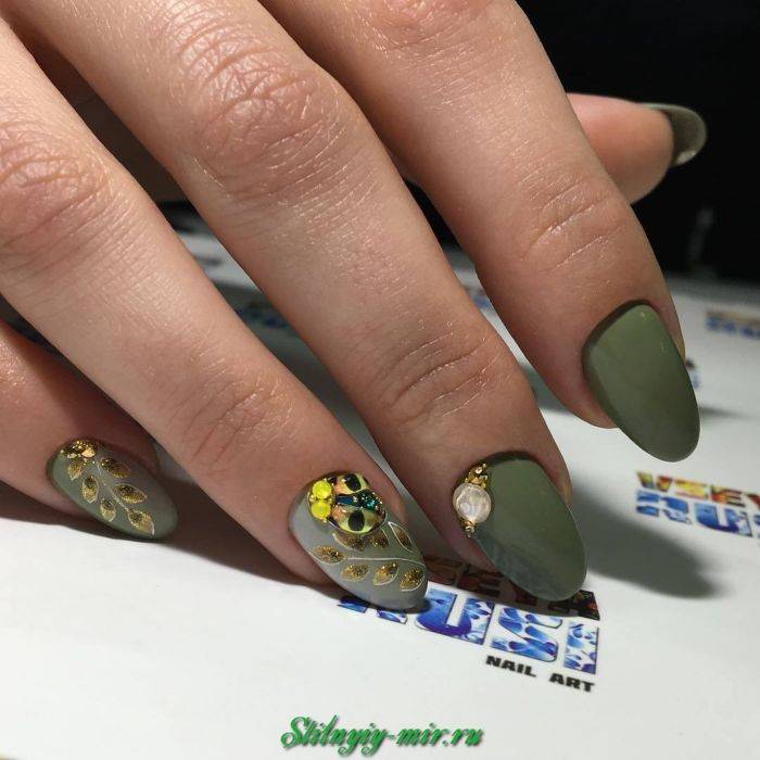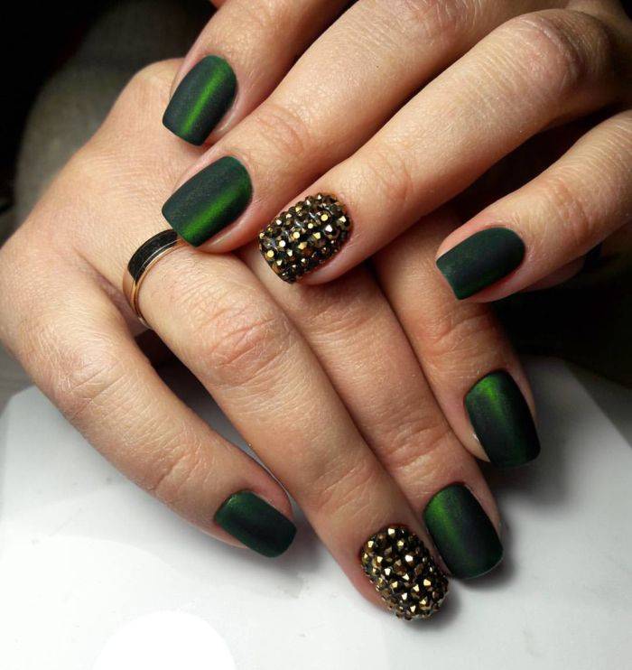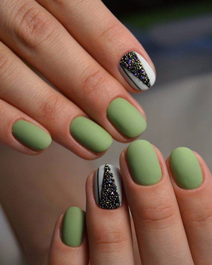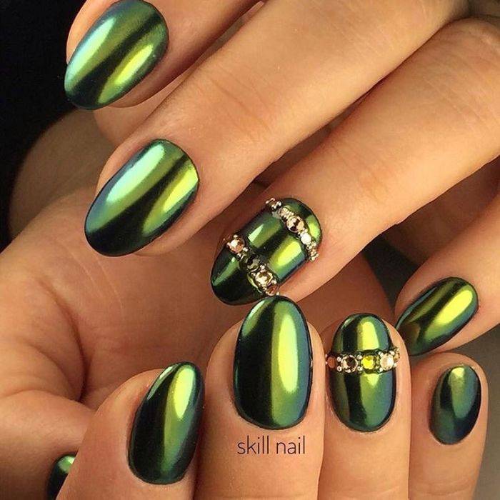 Это самый простой и доступный вариант, позволяющий сделать маникюр более броским и праздничным. Но в случае с хаки не рекомендуется злоупотреблять декором. Просто выделите лунки или улыбку, сделав тонкий блестящий акцент. Если планируете покрыть платину блестками или стразами обильно, выбирайте один или два ногтя.