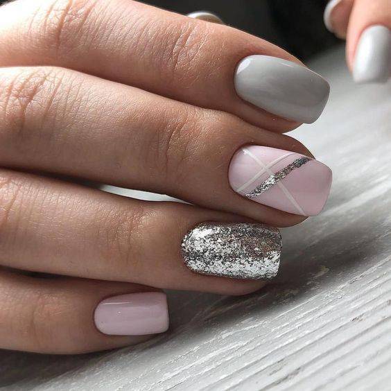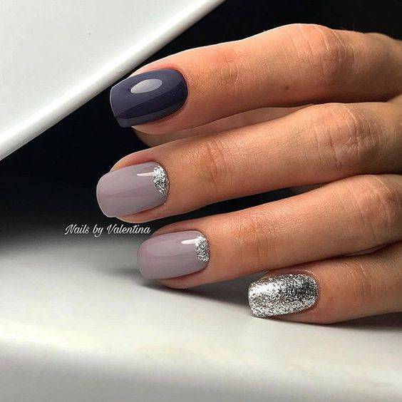 Очень красивые сочетания нюдового розового оттенка с серебряными блестками, нюдового бежевого оттенка с белым гель-лаком и серебряными блестками. К тому же очень нежные и светлые ногти получаются в молочных оттенках с серебристым декором.