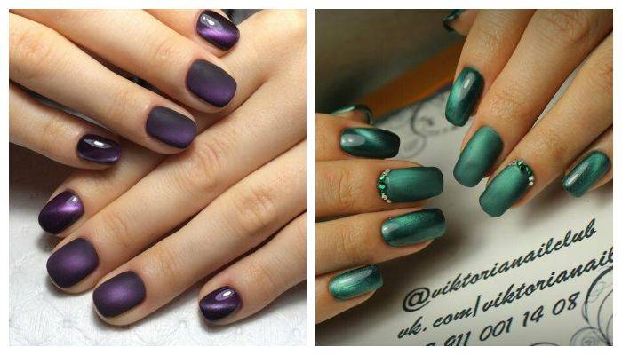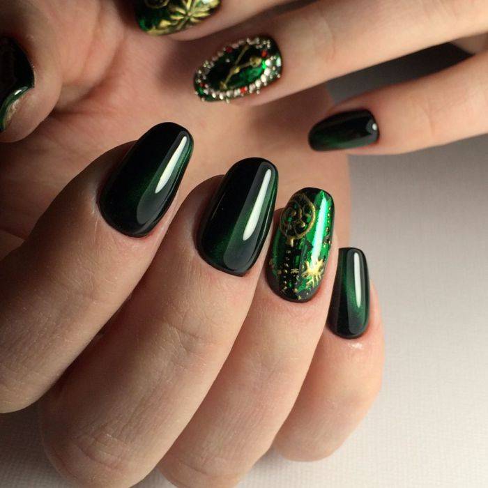 Потрясающе выглядит зеленый маникюр, выполненный в стилистике кошачий глаз. А чтобы придать ему еще большую выразительность и глубину и выразительность цвета маникюра многие мастера перекрывают его финишным слоем витражного лака. С помощью него создается эффект стекла. Этот простой, но эффектный прием можно использовать для создания новогоднего маникюра.