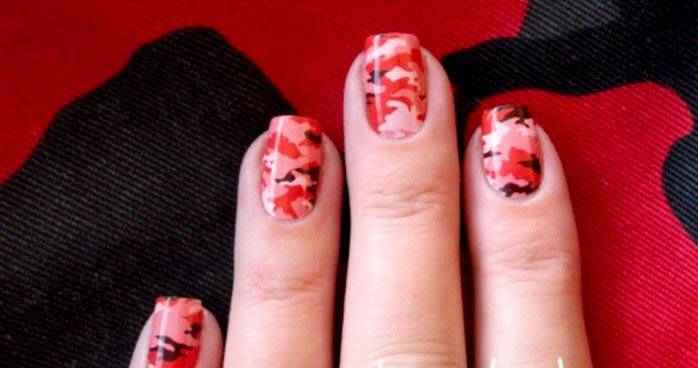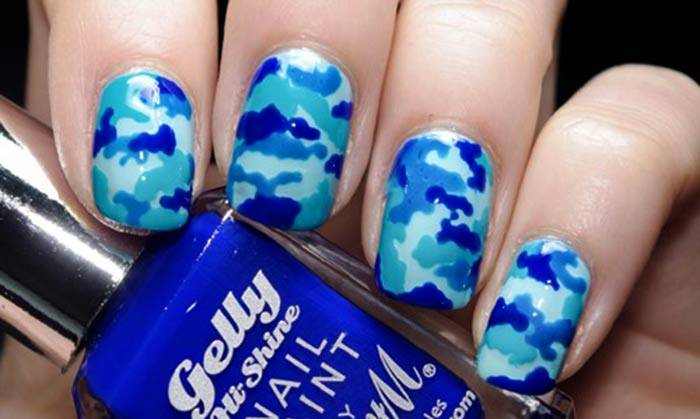 Кстати, камуфлирующие узоры выполняются очень просто. Схема маникюра сводится к нанесению клякс соответствующей раскраски. Конечно, «поиграть» можно с любой гаммой цветов, но для пущей реалистичности стоит все же остановиться на военно-полевой. Прежде всего, это сочетание темно-зеленого оттенка с желтым и коричневым. Подойдет гамма из синих, серых и белых цветов. Так, прежде чем делать такой маникюр, стоит удостовериться, что лаки или гели соответствующих оттенков находятся в косметичке.
