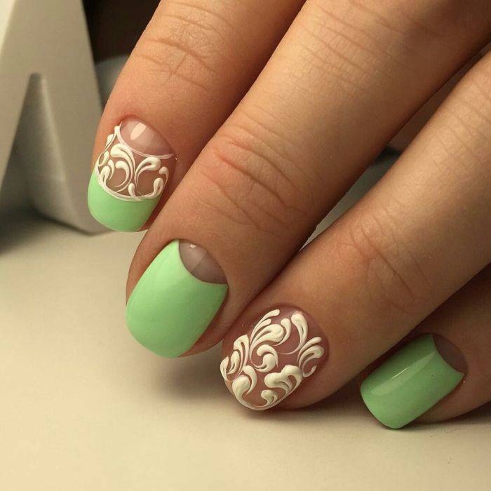 Кружевной маникюр объединяет все качества настоящей женщины: спокойствие, нежность, романтичность, утонченность. Для создания легкого и нежного нейл-арта можно использовать комбинацию зеленого и чистейшего белого. Зеленый лак может наноситься на белую или цветную основу или, напротив, тонкое кружево формируется из белоснежных линий на фоне цветного фона.
