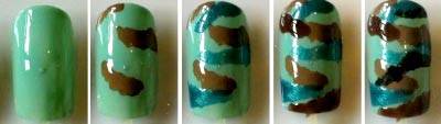 Теперь можно приступать к главному – наносить камуфляжные узоры. Для этого необходимо взять лак или цветной гель, например, болотного цвета, и с помощью тоненькой кисточки нарисовать плавные линии, как на форме военных. Затем черед лака более светлого оттенка. Для этого можно болотный цвет, которым только что были нарисованы линии, разбавить белой эмалью. Конечно, не стоит этого делать непосредственно в самой бутылочке. Эти манипуляции можно провести где-нибудь на фольге или ненужной крышечке. Итак, лаком (гелем) более светлого оттенка нужно аккуратно заштриховать свободные пространства между темными, уже прорисованными линиями. С помощью кисточки нанести пятна коричневого цвета, немножко заходя на зеленые мазки.