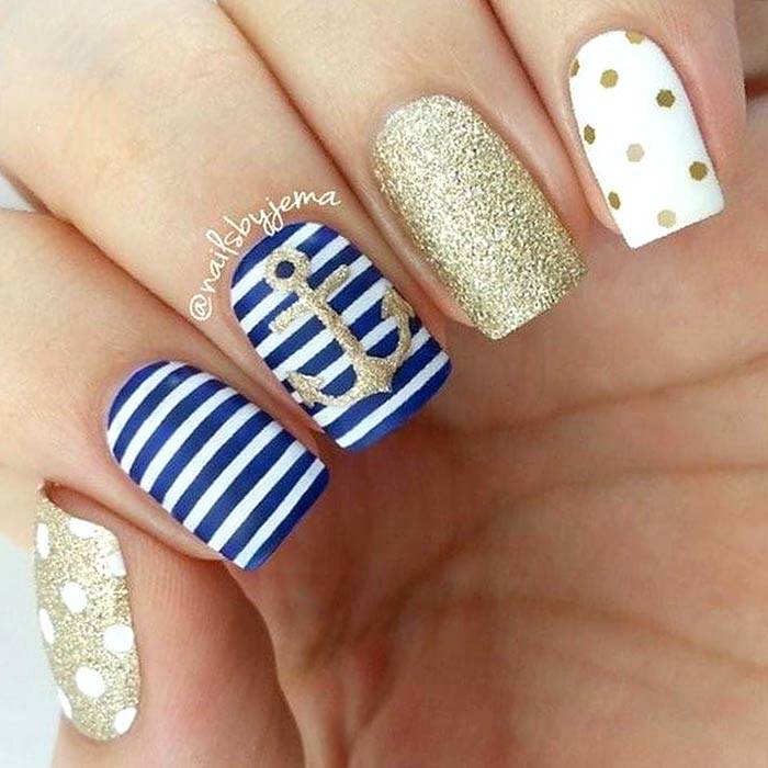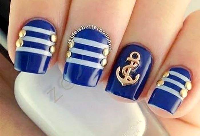Нанесите бело-синие горизонтальные полоски в сочетании с золотым якорем. Такой дизайн выглядит празднично. Маникюр можно дополнить стразами, золотыми металлическими кружочками или камифубуками.