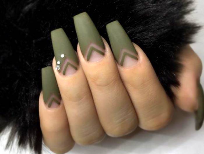 Длинные ноготки не нуждается в визуальной коррекции, поэтому вы можете выбирать более светлые оттенки хаки. Оптимальный вариант — поиграть с дизайном, добавить свободного пространства или сочетать основную палитру с другими модными оттенками лака.
