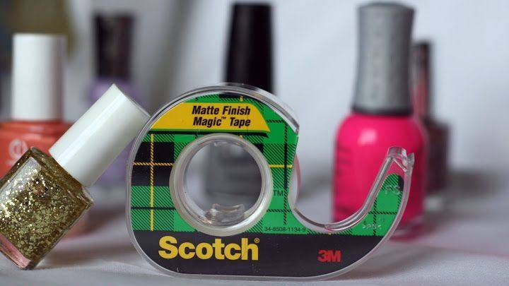- Скотч – обычная липкая лента, позволяющая создавать ровные линии и различные фигуры. Данный материал является незаменимым средством для создания французского маникюра.
