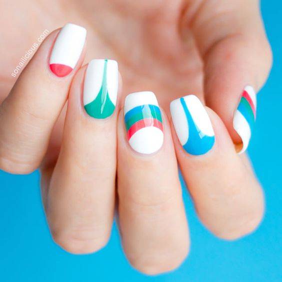Морские мотивы, тельняшка и якоря подойдут для девушек, чьи парни служили в морском флоте. Порадуйте их тематическим маникюром с полосками. За основу берите оттенки синего, как цвет морской волны.