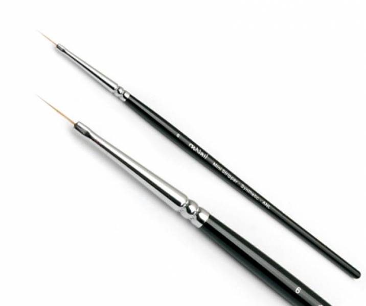- Стриппер – длинная и тонкая кисть из синтетического материала, с помощью которой можно рисовать линии и делать прорисовки. Альтернативой данному изделию могут служить тонкие кисти от лаков.