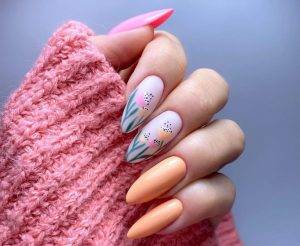 В этом сезоне актуальны овальные ногти в голубых, розовых персиковых и мятных оттенках. Также не менее популярен маникюр в темных тонах на овальные ногти. Модным считается не только однотонный маникюр, но и различный декор ногтей: френч, геометрия, эффект омбре, «перепелиные яйца», лунный маникюр. Также хитом считается покрытие овальных ногтей различными типами фольги: кусочки, переводная фольга, битое стекло. Чтобы украсить маникюр, стоит просто добавить стразы, втирку, гиттер или блестки.