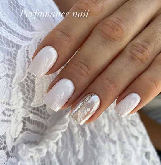 Несмотря на перечисленные выше ограничения, слегка удлиненный свободный край приемлет не только темные оттенки, но и самые нежные варианты дизайна. Это может быть изящный френч, лунный маникюр, матовый бархат, главное – использовать дополнительные украшения, ведь повод обязывает делать ногти более нарядными.