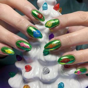 Конечно, повторить такой маникюр в домашних условиях сложно — понадобится целый набор гель-лаков с эффектом металлик. Но почему бы не пойти в салон и не превратить ногти в новогоднее произведение искусства? Кстати, старые елочные игрушки в 2022 году в почете