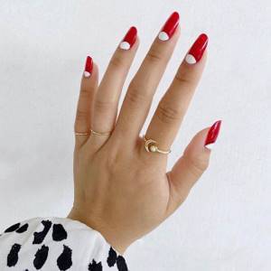- Красный лук великолепно выглядит с золотым. Не возбраняется красный маникюр на тон темнее, черно-белый. Желтые ногти потребуют легализации аксессуарами.