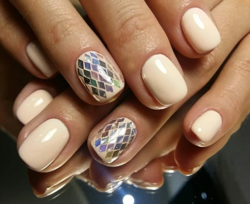 Маникюр с блестками приходится ярким акцентом в образе на коротких ногтях. Блестки, создавая интересную текстуру, не могут остаться незамеченными.
