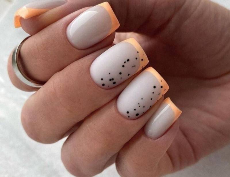- Эффект перепелиных яиц. Конечно же, мы не говорим о рисунках на ногтях в виде перепелиных яиц. Так называется техника с эффектом черных мелких частиц на ногтях. Основа при этом обычно подбирается однотонная, с пастельными тонами. Классика в интересном исполнении. Если вы боитесь экспериментировать, попробуйте неоновый лак с подобным эффектом. Такой маникюр отлично подойдет на короткие овальные ногти.