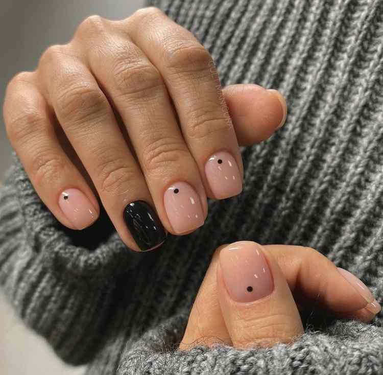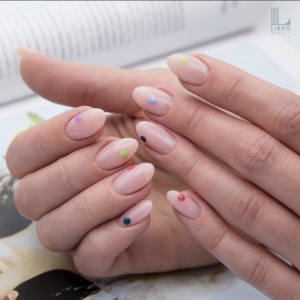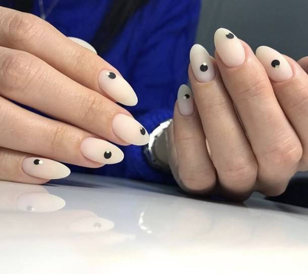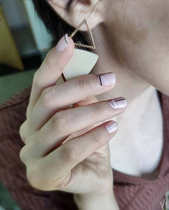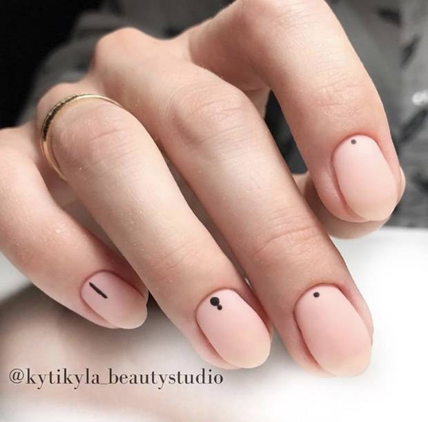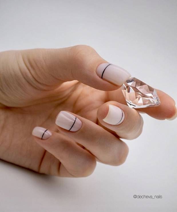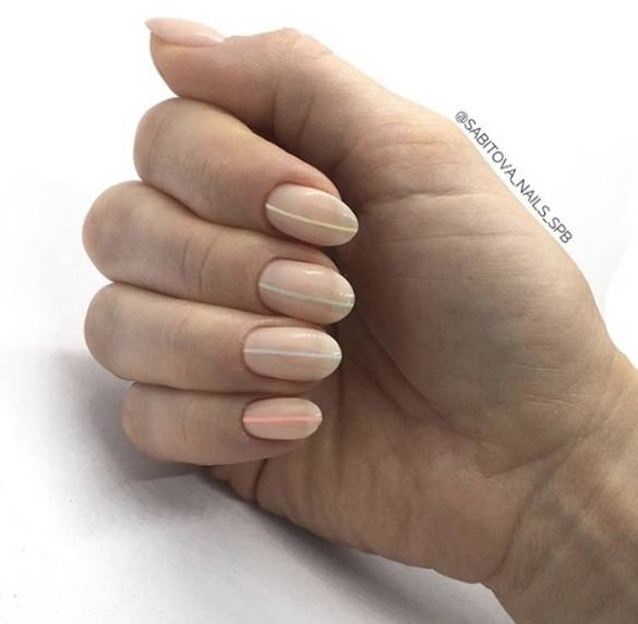 Также очень стильно смотрятся рисунки в виде полосок или точек в минималистичном дизайне ногтей. Можно на нюдовом или прозрачном фоне нарисовать по одной горизонтальной или вертикальной полоске на каждом ноготке. Или на таком же фоне нарисовать по одной точке у основания каждого ногтя, причем сделать это можно как одним цветом, так и при помощи разных цветов.