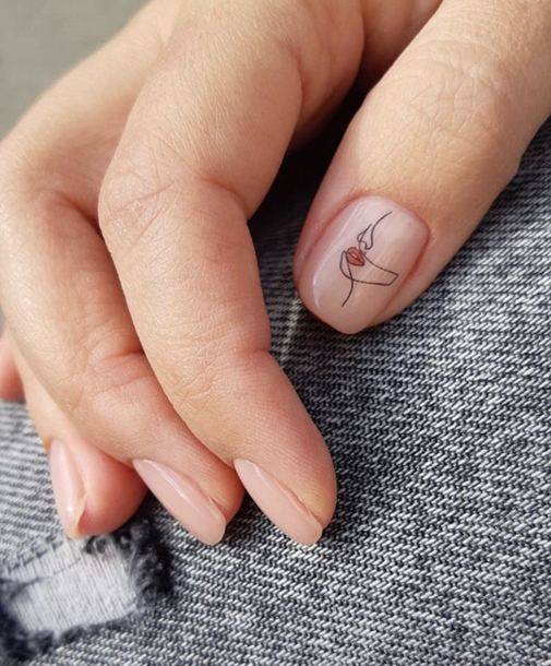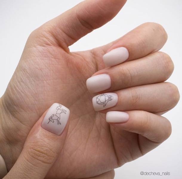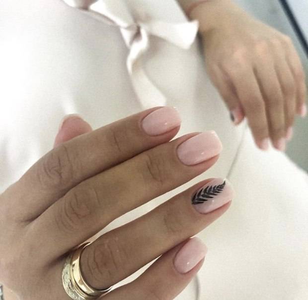 Маникюр в стиле минимализм смотрится умеренно на коротких ногтях и представляет собой однотонное покрытие с наличием не больших маленьких рисунков.