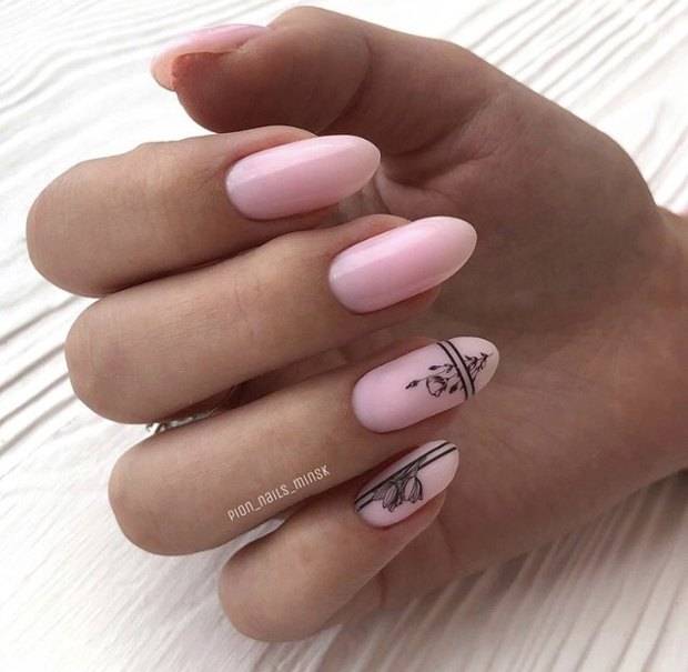 - Классика и модный штрих. Традиционный вид маникюра в одночасье станет модным, если выделить один-два ногтя с помощью рисунка. При этом вид самого изображения может быть любым — цветы, графика, орнаменты, замысловатые узоры или окрашивание по технике омбре. Также допускается декор в виде бусин, страз и лепки.