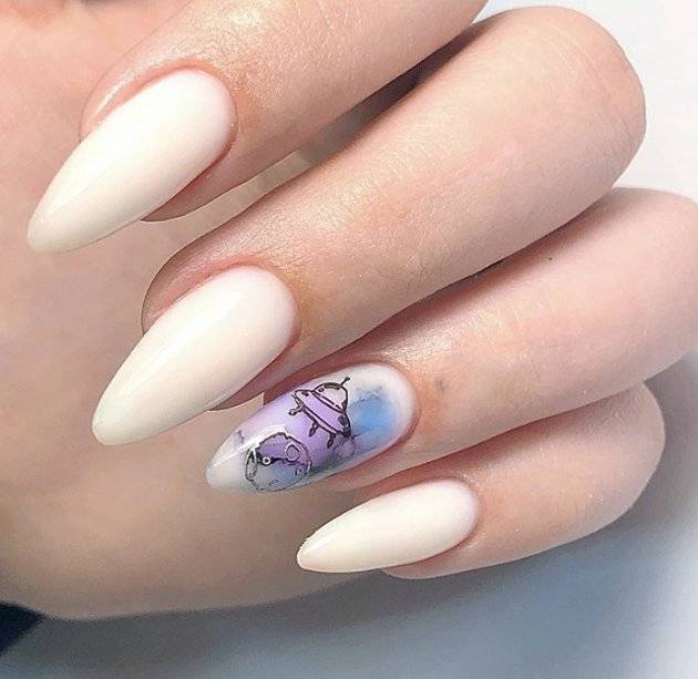 - Свободная зона. Независимо от того, что ногти и так не обладают существенной длиной, не закрашенная улыбка их нисколько не укоротит. К тому же, если в этом маникюре выделить один ноготь рисунком в графическом стиле, то отсутствие длины и вовсе перестанет быть заметным.