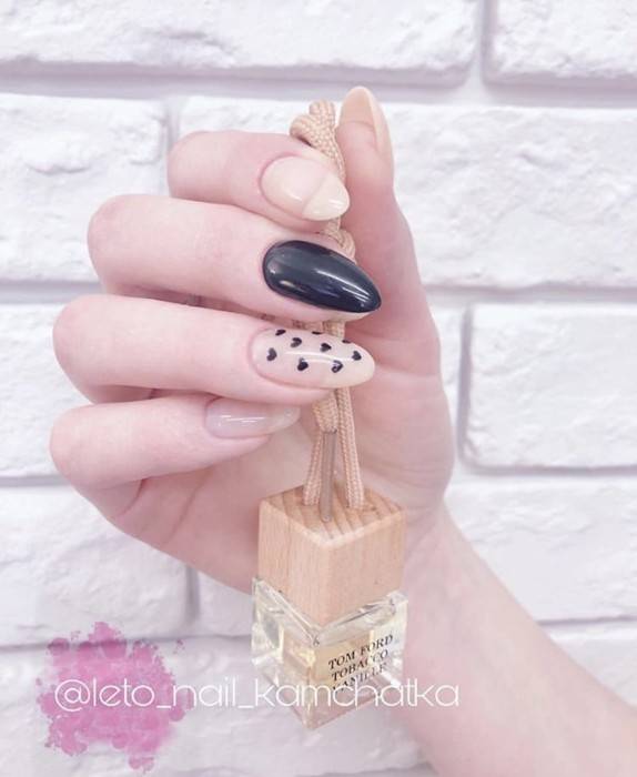 - Эффект перепелиных яиц. Конечно же, мы не говорим о рисунках на ногтях в виде перепелиных яиц. Так называется техника с эффектом черных мелких частиц на ногтях. Основа при этом обычно подбирается однотонная, с пастельными тонами. Классика в интересном исполнении. Если вы боитесь экспериментировать, попробуйте неоновый лак с подобным эффектом. Такой маникюр отлично подойдет на короткие овальные ногти.