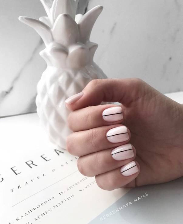 Маникюр с полосками отличается лаконичностью и простотой выполнения. Для создания линий на коротких ногтях понадобится тонкая кисть или скотч-лента.