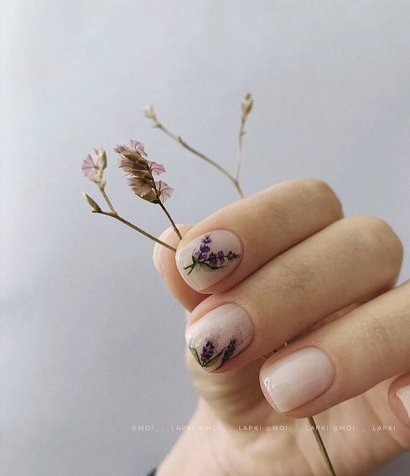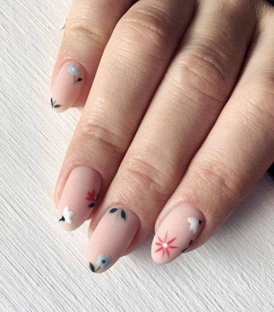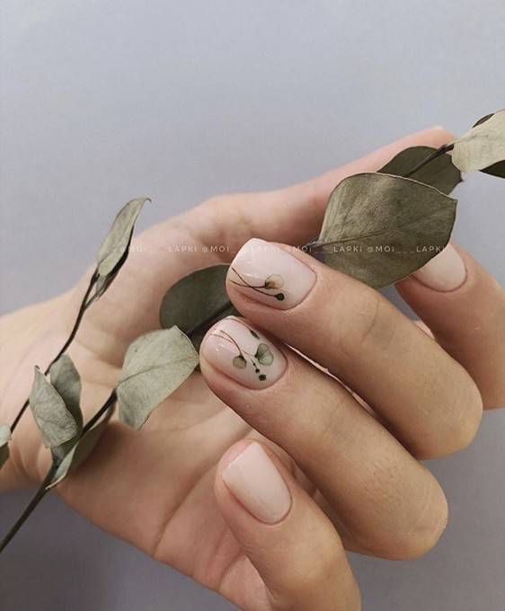 В минимализме очень популярны рисунки с флористическим дизайном. Это миниатюрные рисунки цветов, растений и веточек. Они могут быть выполнены в технике акварель или просто нарисованы кистью, при помощи черной, белой или цветной гель-краски. Также они могут быть нанесены на ноготки в виде слайдеров (наклеек), или сделаны с помощью стемпинга.