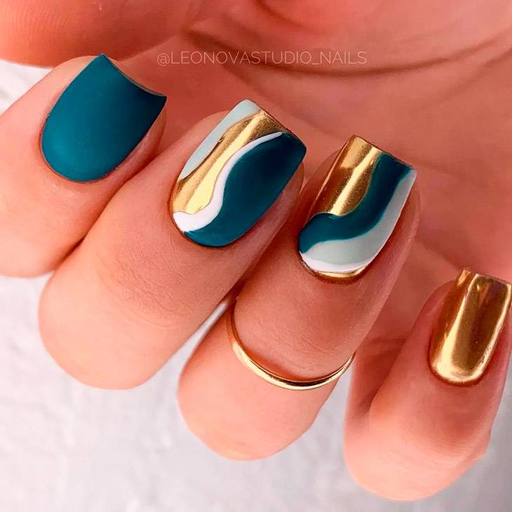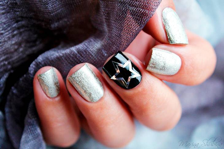 Актуальным серебристым маникюром станет «френч», в котором будет сочетаться лак с матовым и глянцевым эффектами. Золотистый цвет наиболее выгодно смотрится в комбинации с черным, поэтому любые рисунки и узоры раскроют самые лучшие стороны этого оттенка.