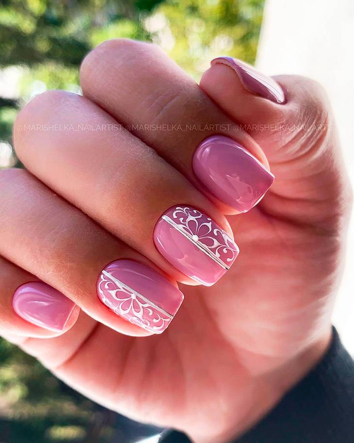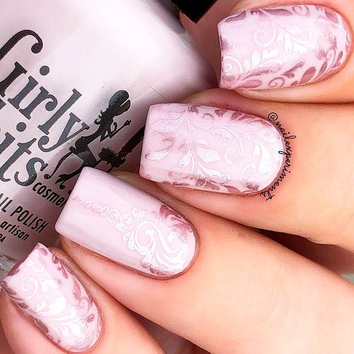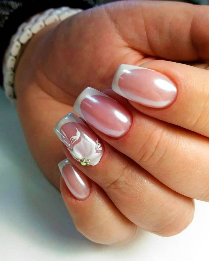 Оригинально выглядит френч с рисунком. В качестве композиции могут выступать цветы, геометрические узоры и этнические орнаменты. При выполнении свадебного маникюра на короткие ногти стал очень популярен декор вензелями и стразами.