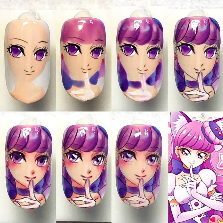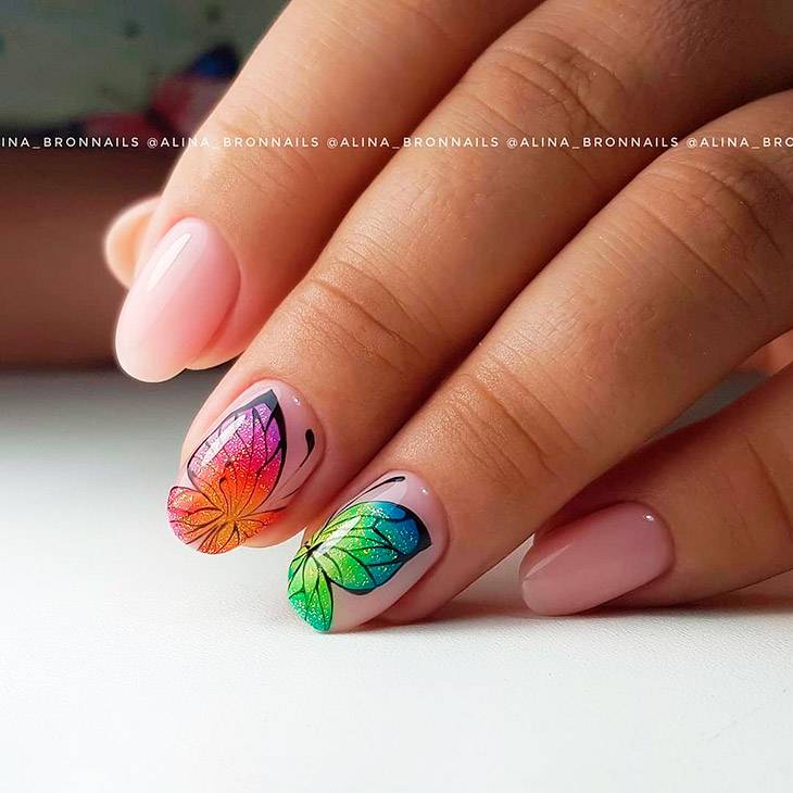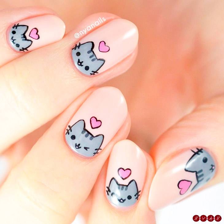 Милый маникюр характеризуется светлыми радужными тонами и наличием наклеек и маленьких мультипликационных элементов декора.