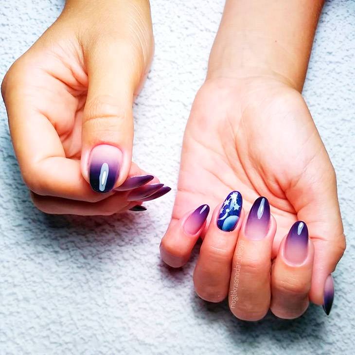 Маникюром в стиле омбре называют плавный переход из одного цвета в другой. Очень часто встречается переход их розового в белый. может выполняться с помощью кусочка губки или специального оборудования.